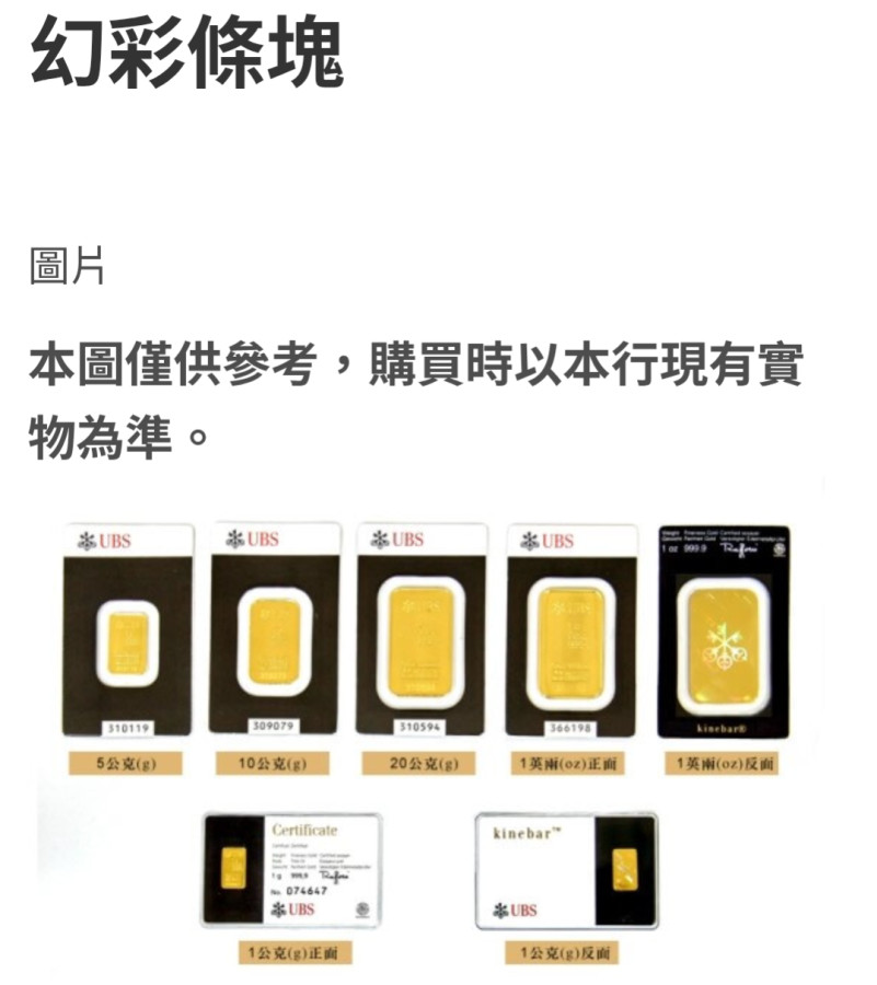 本行銷售之瑞士銀行幻彩條塊,以1台兩(37.5公克)、1英兩(31.1公克)、20公克、10公克、5公克及1公克等規格為主,各規格條塊視供應情形掛牌銷售。