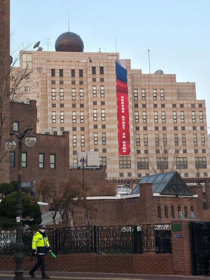 明日(24 日)是俄羅斯入侵烏克蘭四周年,在南韓,俄羅斯大使館上周二(17 日)在大樓外張掛了一幅直幡,用俄語寫着「勝利將會屬於我們」。南韓外交部昨日(22 日)表示,已要求俄方除下直幡。聲明稱,南韓已向使館表達關注。俄方表示直幡為慶祝節日,稍後會除下。