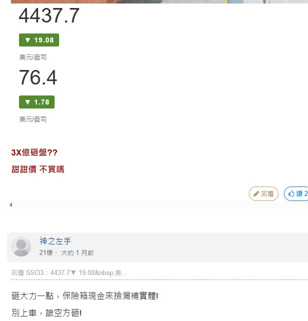 我身邊同事也有阿亮左手。1月瘋漲都閉嘴平常沒什麼交集聊天,1月底崩就跑來瞎聊,說黃金沒股利,黃金跟人工鑽一樣會量產哩哩扣扣(就是阿亮左手翻版)。
