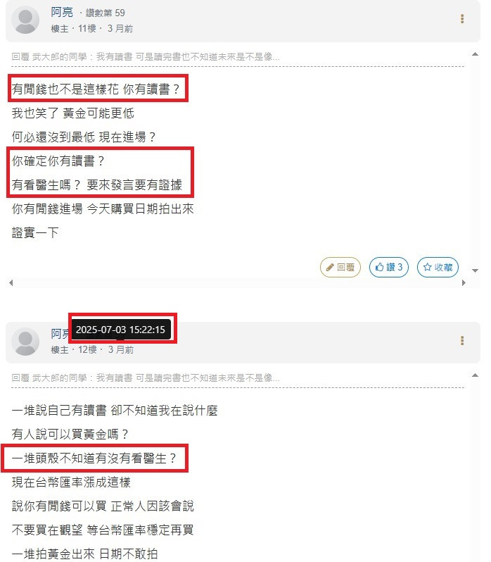 你眼睛有問題嗎?台幣貶破32不會看?這幾天台幣貶3%,你還在台幣大漲,你整天希望金價跌,你賺的什麼?你們常說中國壞,既然知道還不趕快買黃金,整天存害人的心,幾年了還不反省