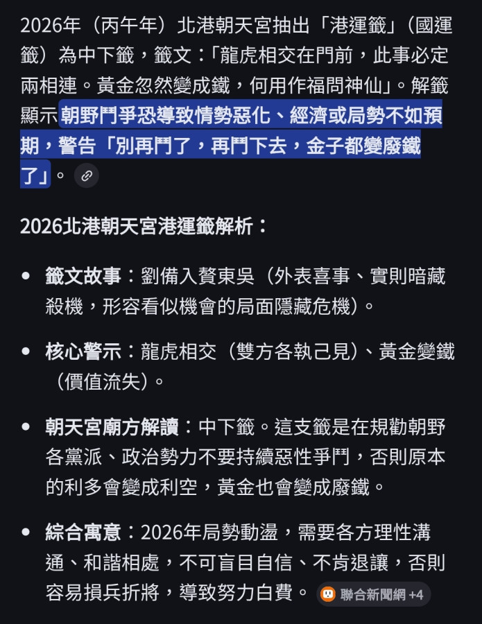 2026 年(馬年)北港朝天宮在正月初四抽出的「港運籤」(即國運籤)是 第 32 首「己卯籤」,這首籤在當時引起了全台不小的震撼,被廟方定調為 「中下籤」。